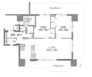 LDK15.1畳1室 洋室5.4畳1室 洋室4.9畳1室