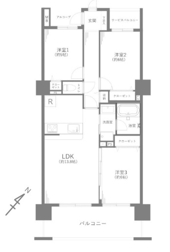 LDK13.8畳 洋室5畳 洋室6畳2室
